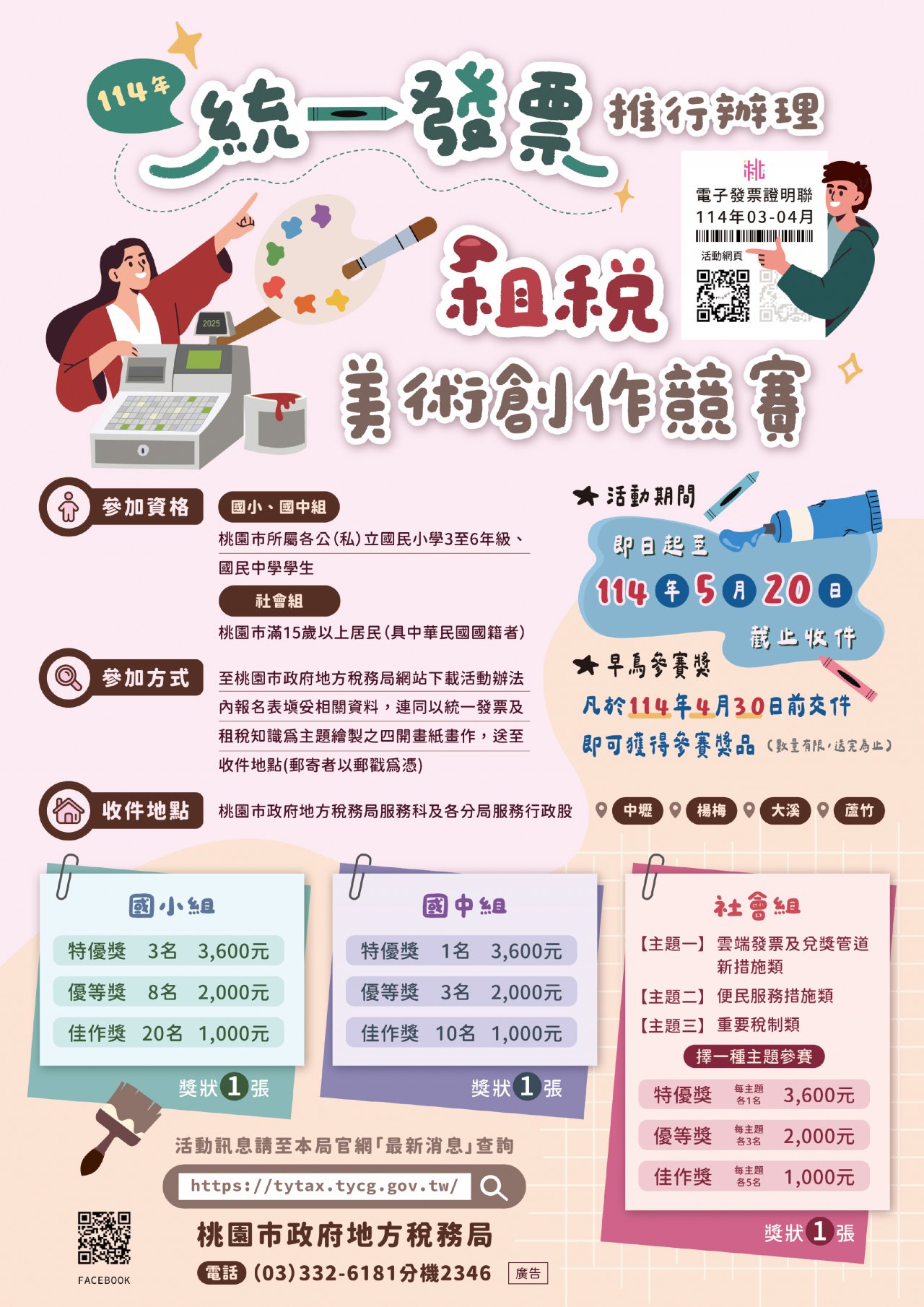 主旨: 檢送本局 114 年統一發票推行辦理租稅美術創作競賽海報及活動辦法各 1 份,請鼓勵學生踴躍參加,請查照。