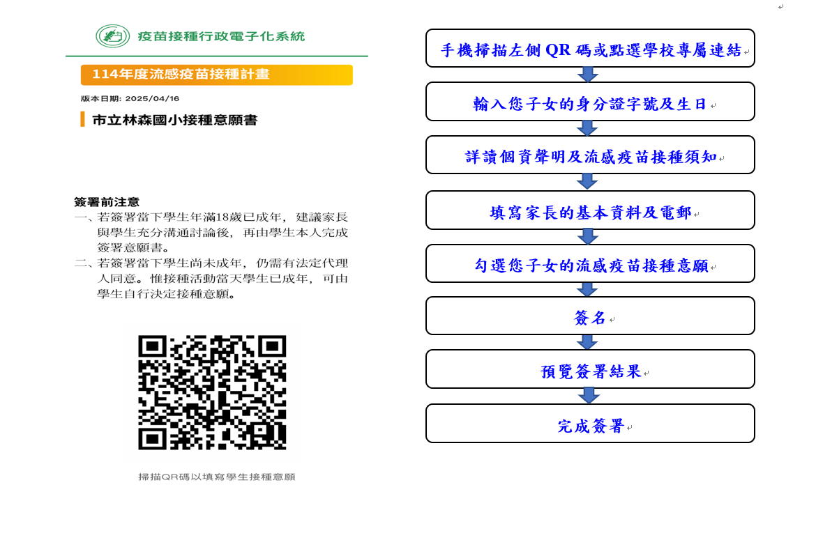 因應E化及減紙政策,本縣/市與衛生福利部疾病管制署合作推行疫苗接種行政電子化系統(NIAS),改以提供簽署網頁連結網址及QR code的方式,導引您進入NIAS進行線上意願簽署,只需要用手機掃描QR code或點選QR code下方連結,即可於線上完成簽署作業,簽署截止期限為114年9月26日(五)下午15:00截止,截止期限前您都能透過上述方式登入簽署網頁修改接種意願。或點選以下連結:(https://reurl.cc/LnZb67)