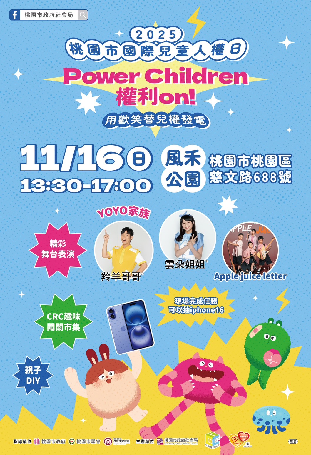 主旨: 有關本府社會局辦理「114 年度國際兒童人權日「Power Children 權利 On! 用歡笑替兒權發電」系列活動資訊一案,請查照。