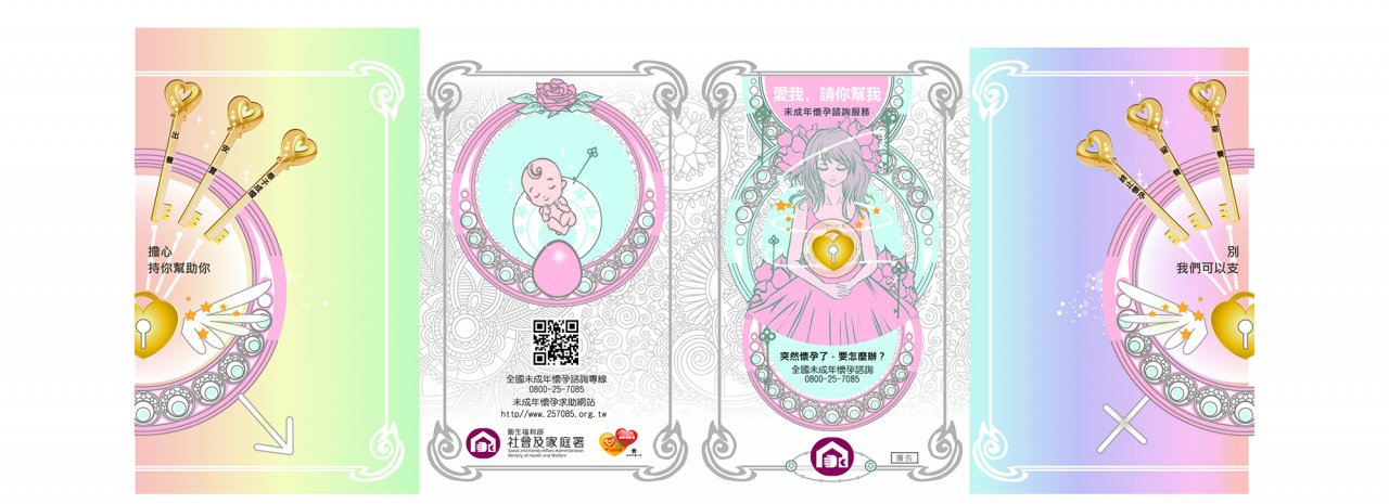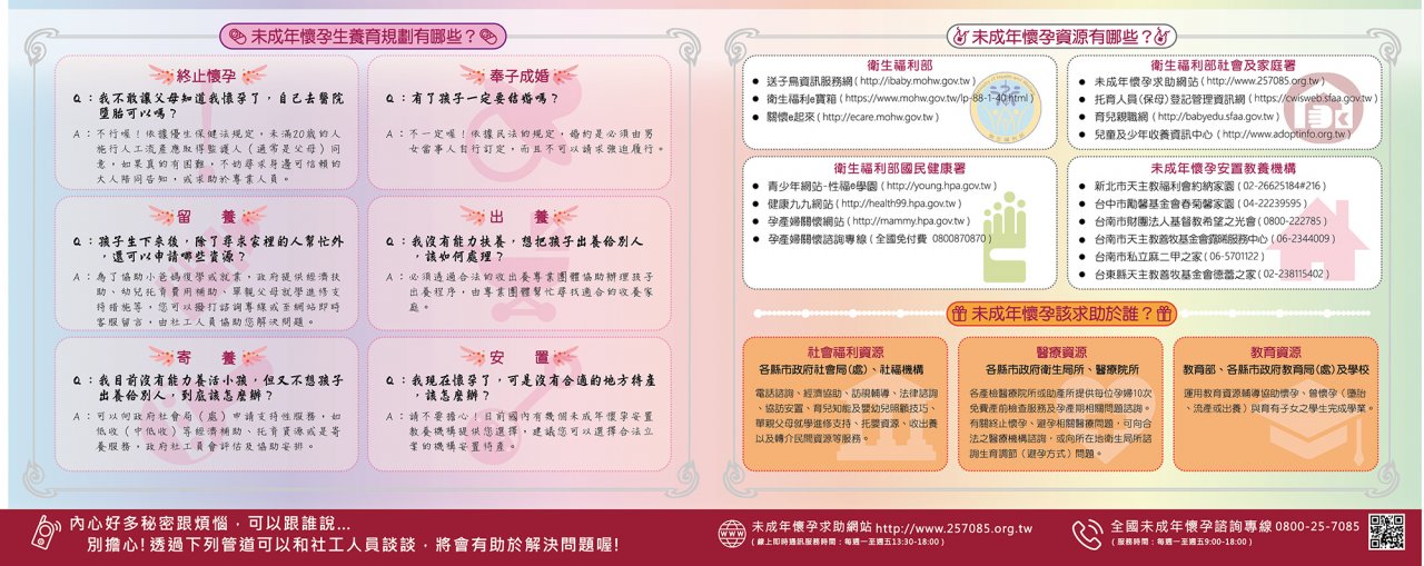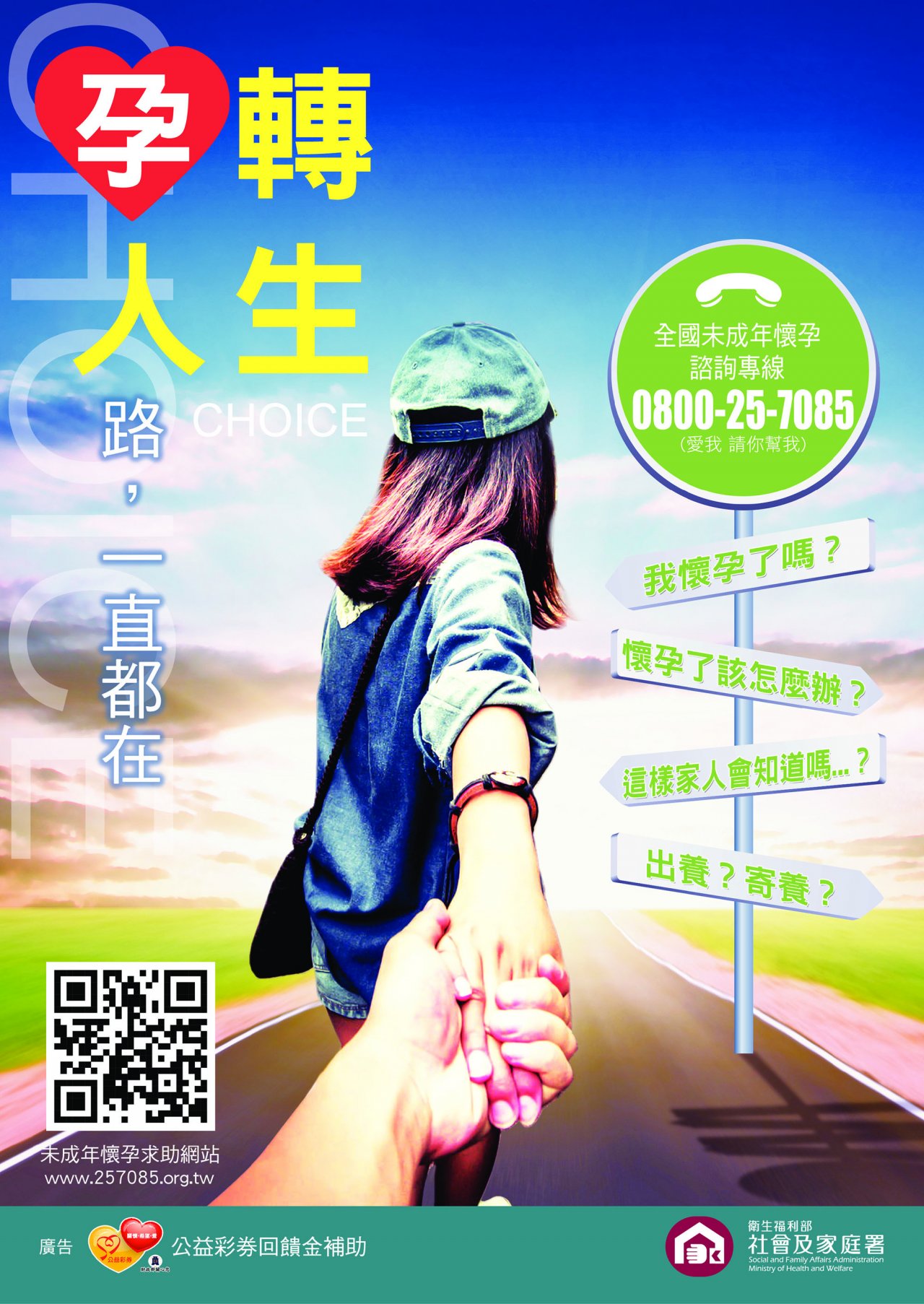 二、 本案宣導海報及宣導品電子檔置於衛生福利部社會及家庭署全球資訊網(首頁/主題專區/家庭支持/未成年懷孕服務專區/民眾/宣導品, https://www.sfaa.gov.tw/SFAA/Pages/Detail.aspx?nodeid=1208&pid=9549),請貴校逕行下載運用。另「全國未成年懷孕諮詢專線」(0800-257085)及「未成年懷孕求助網站」(https://257085.sfaa.gov.tw/),提供遭遇困境未成年懷孕少女、家屬及其重要他人近便性、即時性諮詢管道。