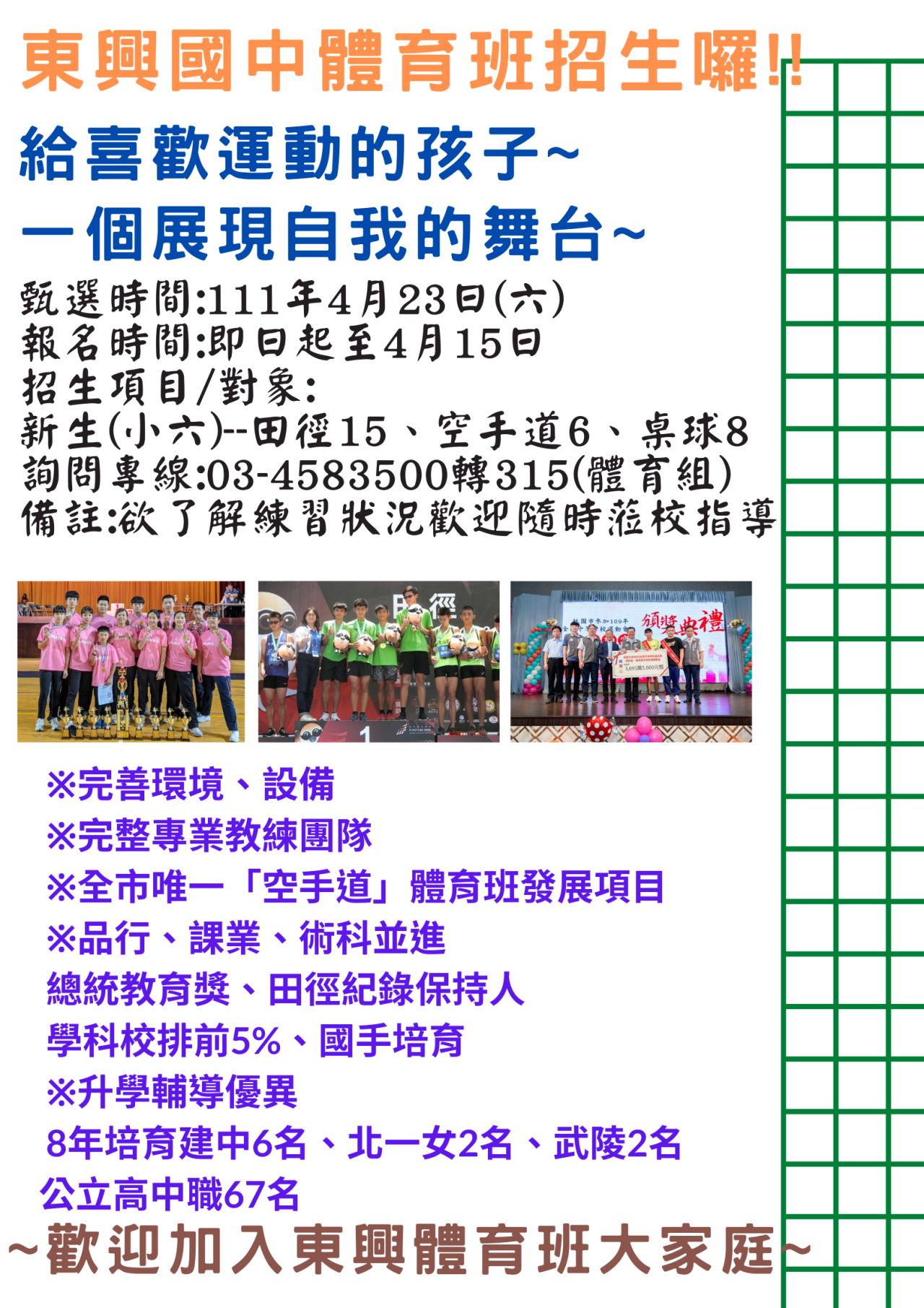 檢送東興國民中學111 學年度體育班新生(含轉學、轉班生)入學甄選簡章,敬請惠允協助公告周知,並請鼓勵所屬學生踴躍報名,請查照。 |