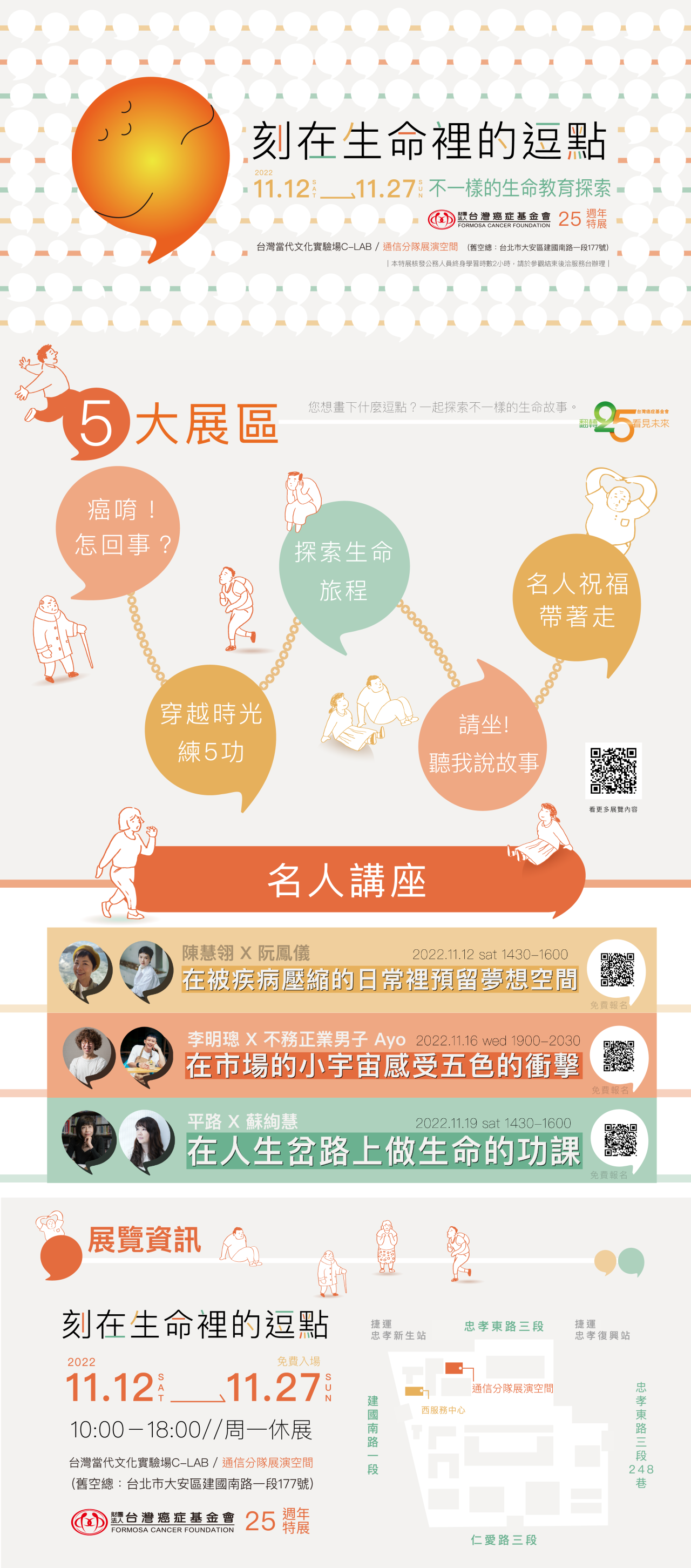 二、 基金會走過四分之一世紀,始終秉持初心-宣導「癌症不是絕症」、「癌症可以預防」,去除國人對癌症的恐懼與迷思,讓民眾從避諱談論,轉變為對自我健康的關注與管理,提升國人對癌症防治的重視。於成立 25 週年之際,特別策劃「刻在生命裡的逗點」特展,強化「互動」、「體驗」,以引領民眾進行身體及健康的對話,掌握預防癌症的關鍵,內容豐富精采寓教於樂,適合各年齡層參觀,闔家共賞!