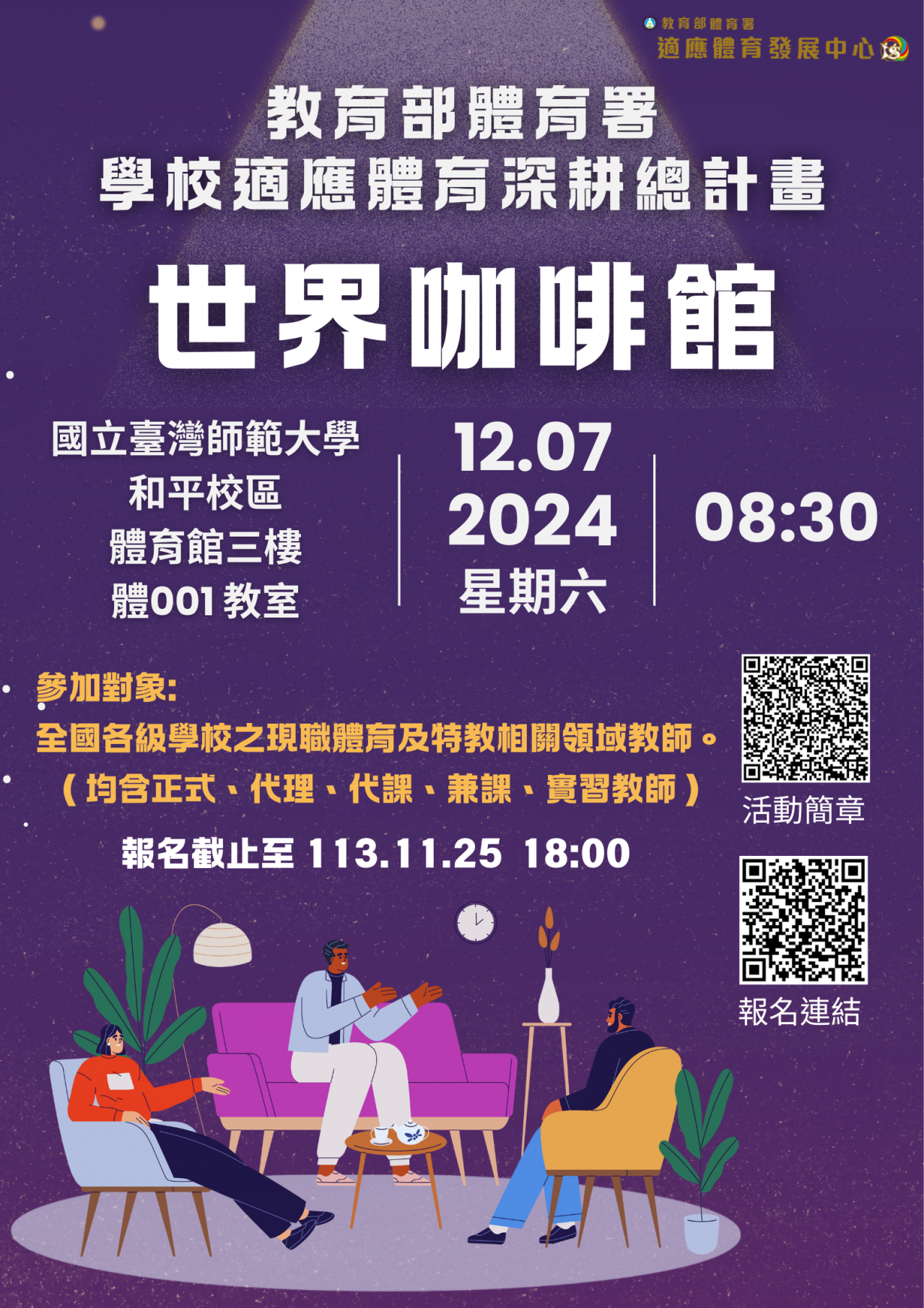(三) | 活動地點:國立臺灣師範大學和平校區 I 體育館 3 樓體 001 教室(臺北市大安區和平東路一段 162 號)。 |