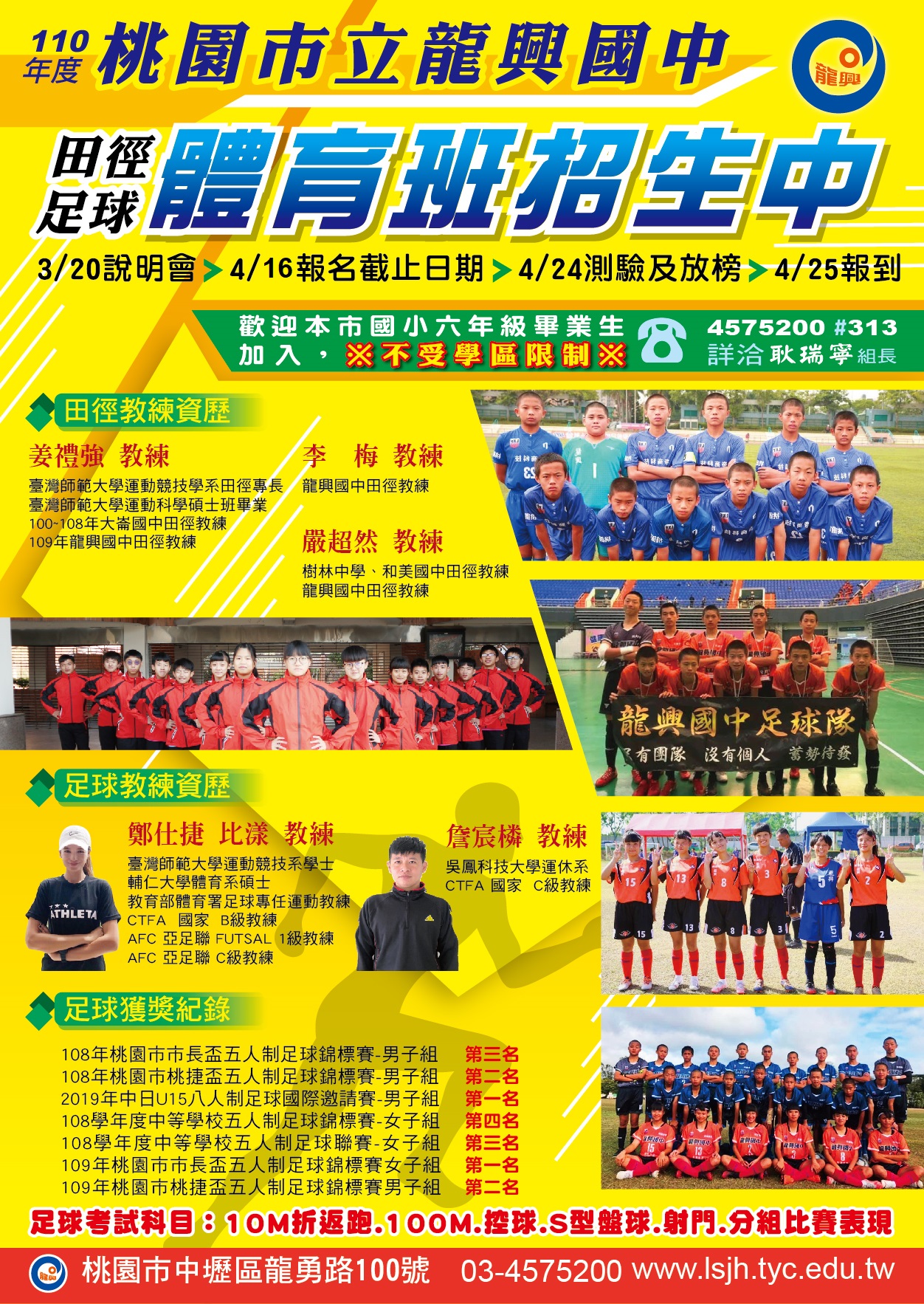 本校「桃園市立龍興國民中學 110 學年度體育班新生入學暨轉學轉班甄選簡章」乙份,請惠予公告並將相關升學資訊轉知貴校學生、老師及家長,敬請查照。 |