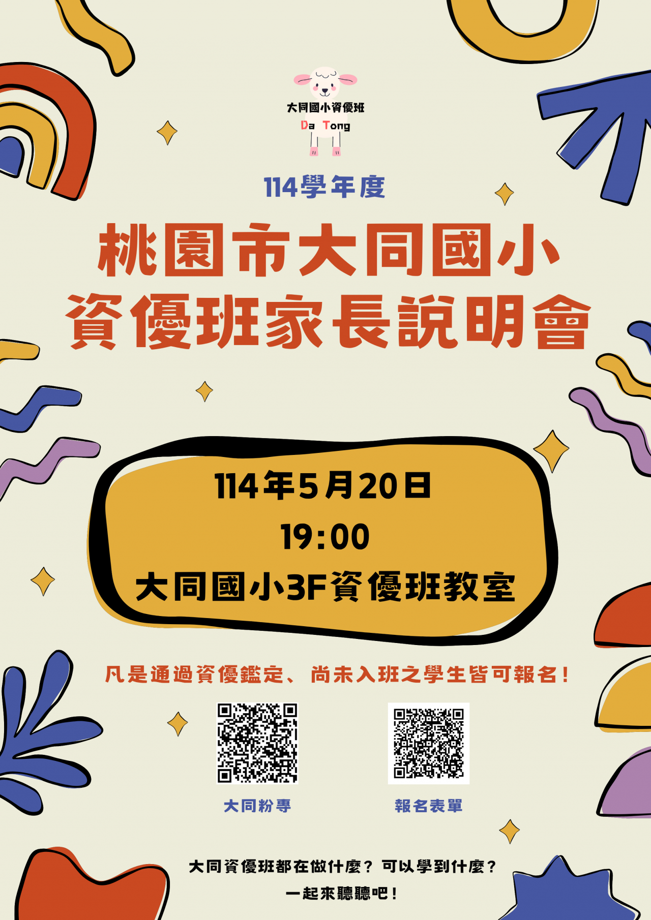「114 學年度大同國小資優班招生家長說明會」,敬邀貴校各年級資優生家長參加,敬請惠予公告並轉知貴屬家長,請 查照。 |