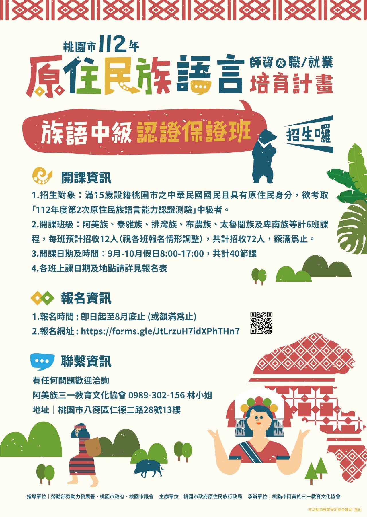主旨: | 轉知本府原住民族行政局辦理「桃園市 112 年原住民族語言師資及職(就)業培育計畫-原住民族族語中級認證班」報名資訊一案,請查照。 |