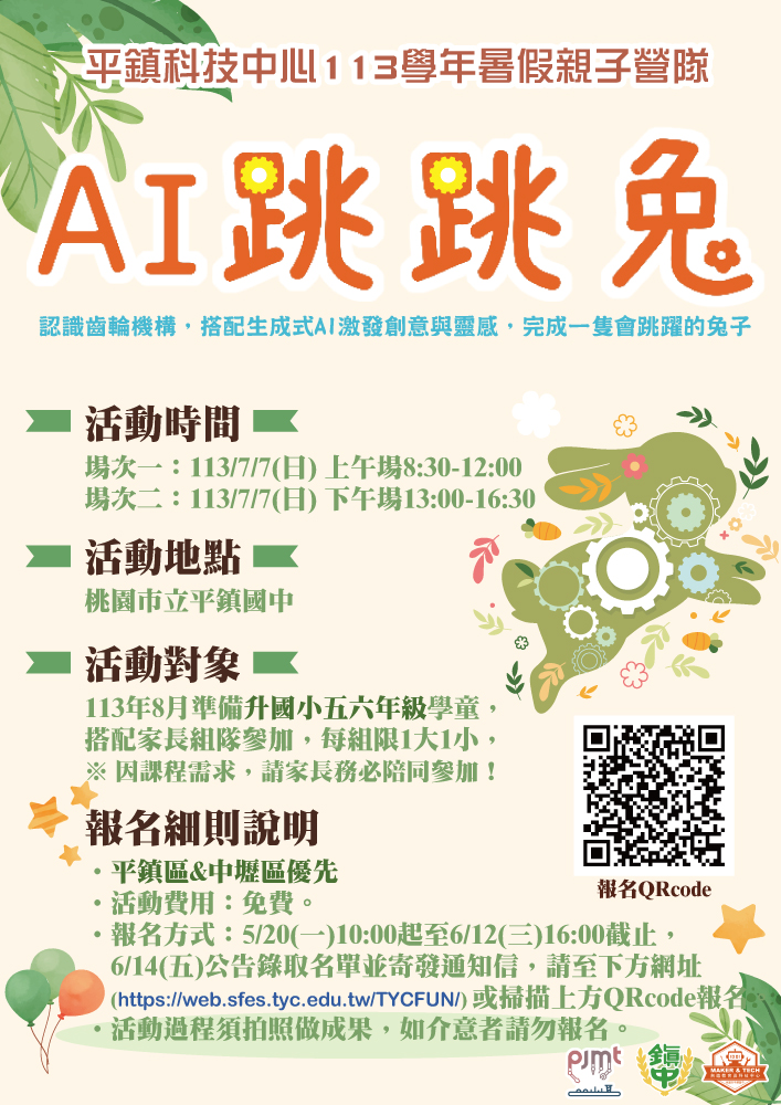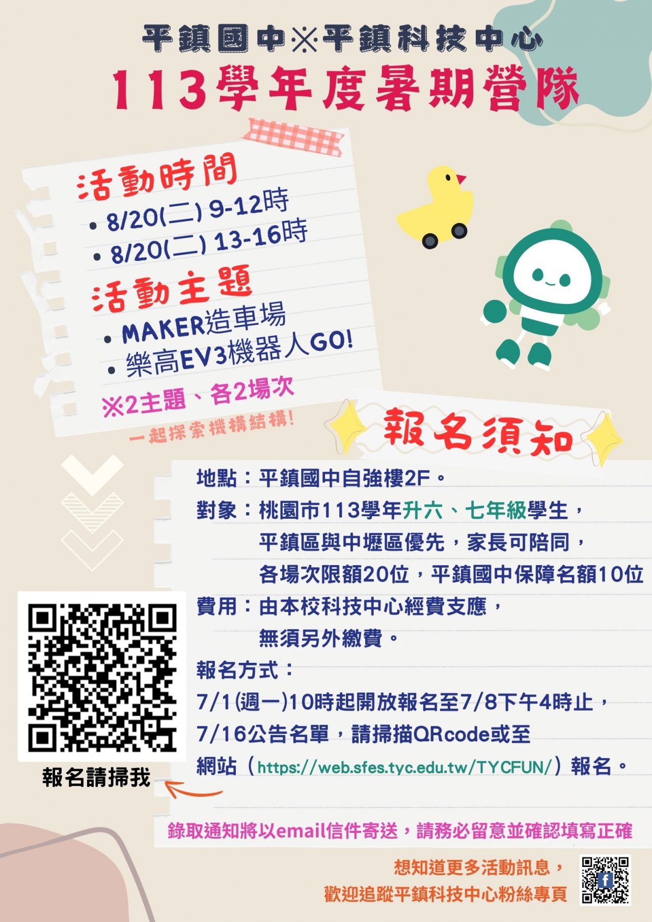 主旨: | 有關本校辦理平鎮自造教育及科技中心 113 年暑假營隊,敬請協助公告周知,活動辦法詳如說明,請查照。 |