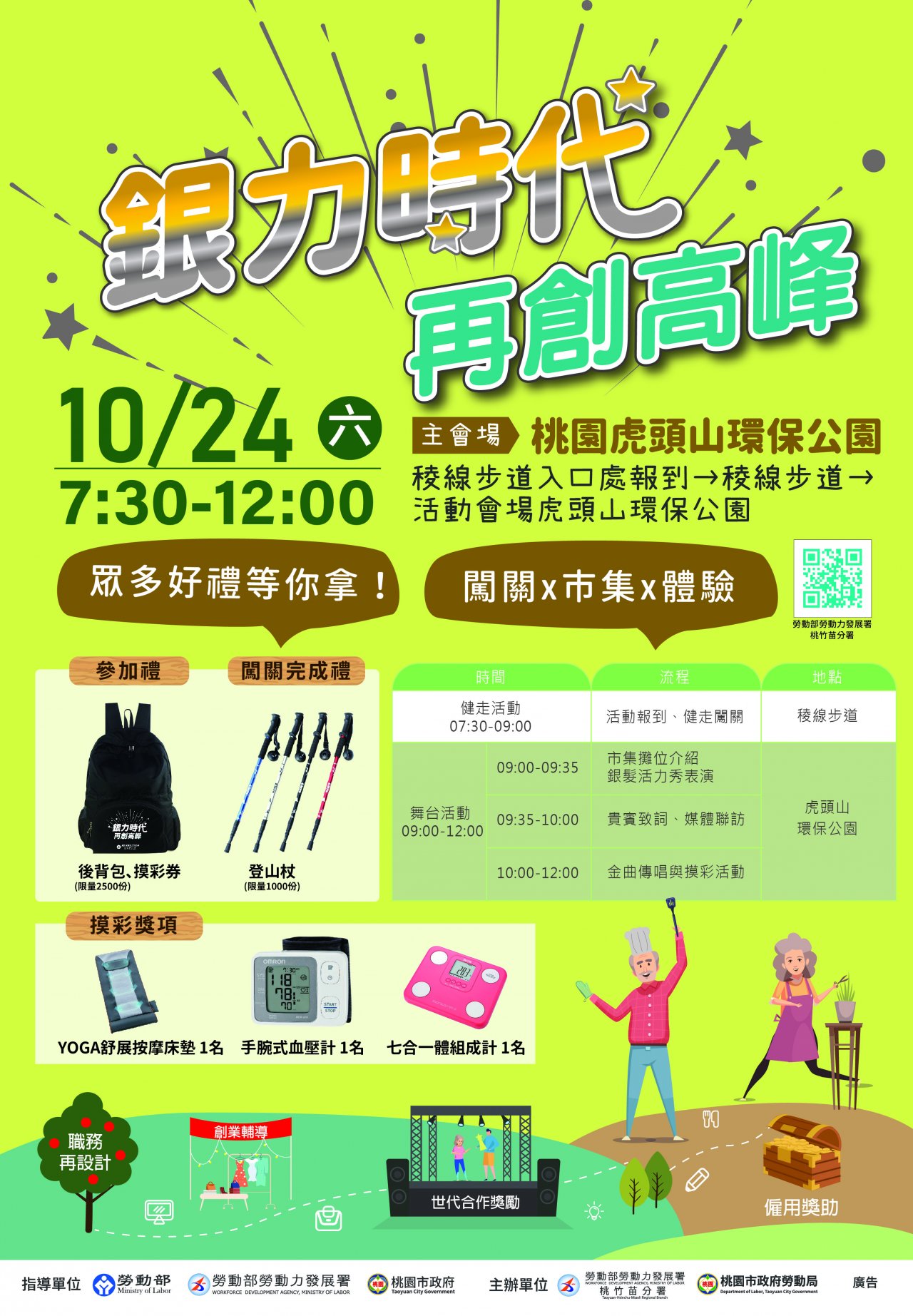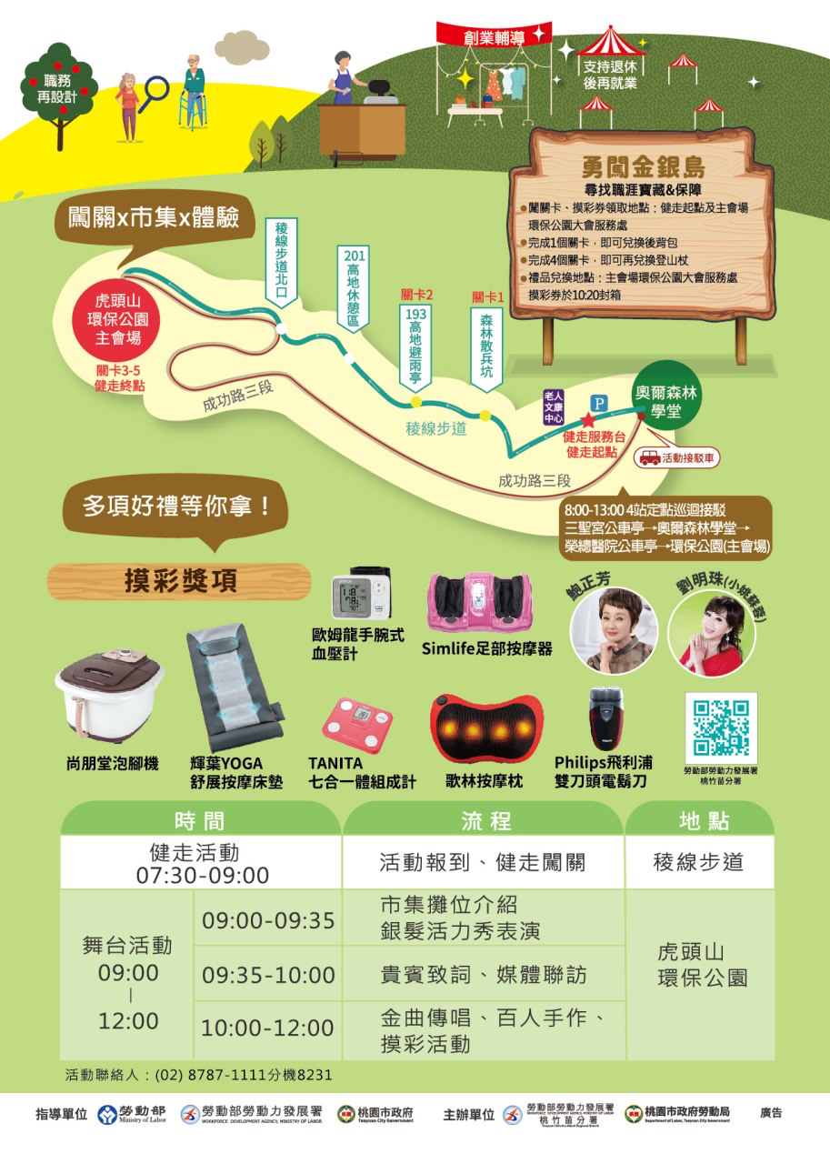 一、旨揭活動訂於 109 年 10 月 24 日(星期六) 7 時 30 分至 12 時假桃園虎頭山環保公園辦理,活動內容包含完成闖關可參加摸彩、市集攤位及銀髮活力秀、金曲傳唱等表演;另活動設有定點巡迴接駁車,歡迎參與民眾多加利用。