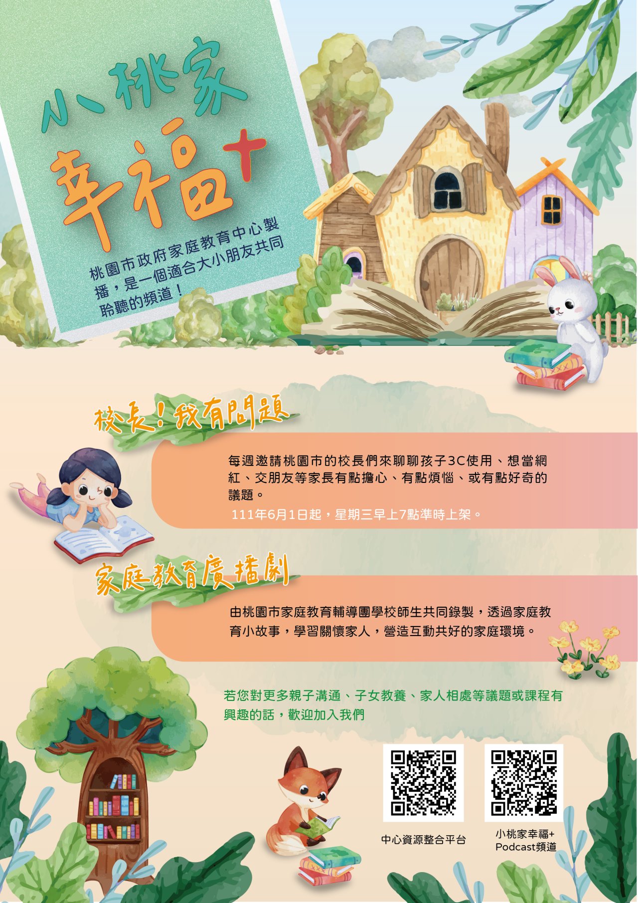 三、 「小桃家幸福+」Podcast 平台可點選連結 https://reurl.cc/g0RWeN 或掃描海報 QR Code 收聽,節目單元介紹如下: