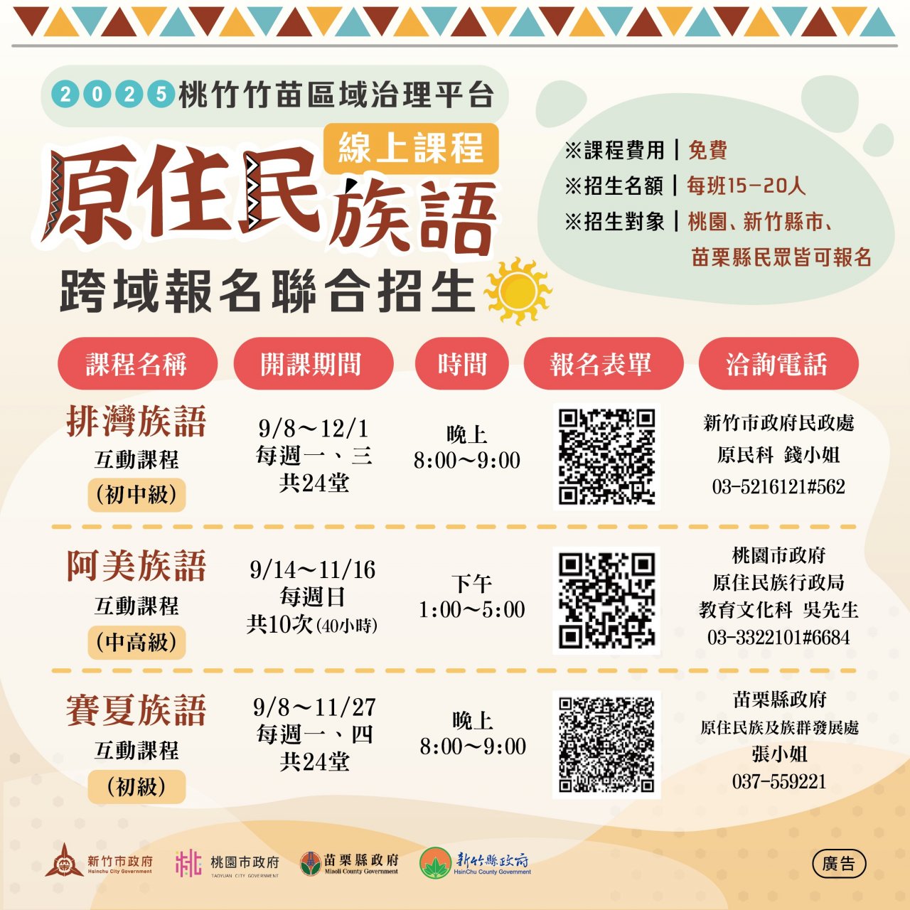 | 二、 | 為促進原住民族語學習資源共享與文化傳承,桃園市、新竹縣、新竹市及苗栗縣等四縣市政府攜手合作,整合原住民族語線上課程資源,推出「原住民族語線上課程聯合招生」計畫,開放四地民眾自由報名選修,突破區域與交通限制,實現族語學習「零距離」,有效提升學習便利性與參與率,促進資源共享並推動文化傳承。 |