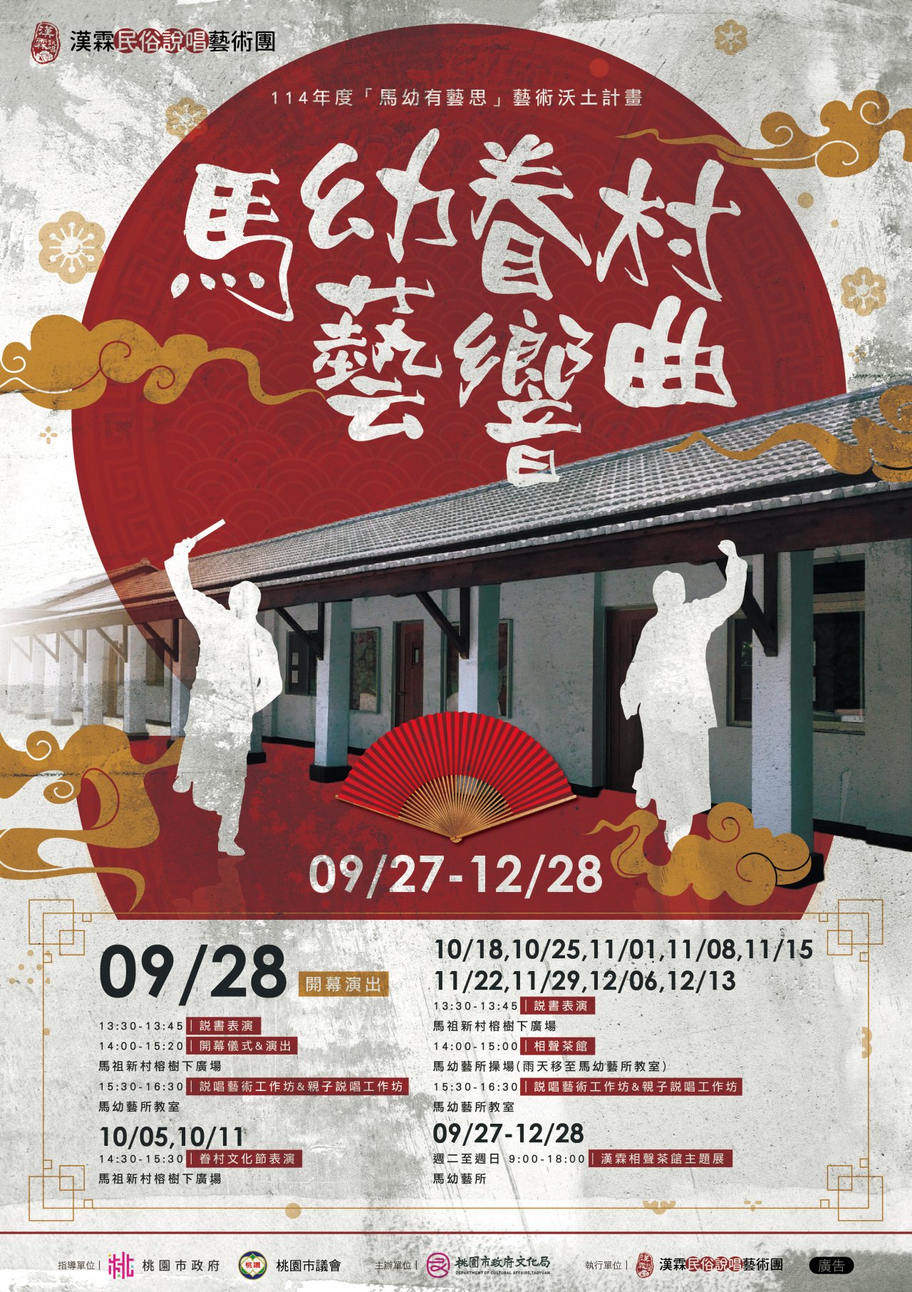 二、 本(114)年度第 3 期由漢霖民俗說唱藝術團進駐,舉辦「馬幼眷村藝響曲」系列活動,包括:「相聲茶館」展演、說書定期表演、說唱藝術工作坊、親子說唱工作坊及「相聲茶館」主題展(活動內容詳如附件)。