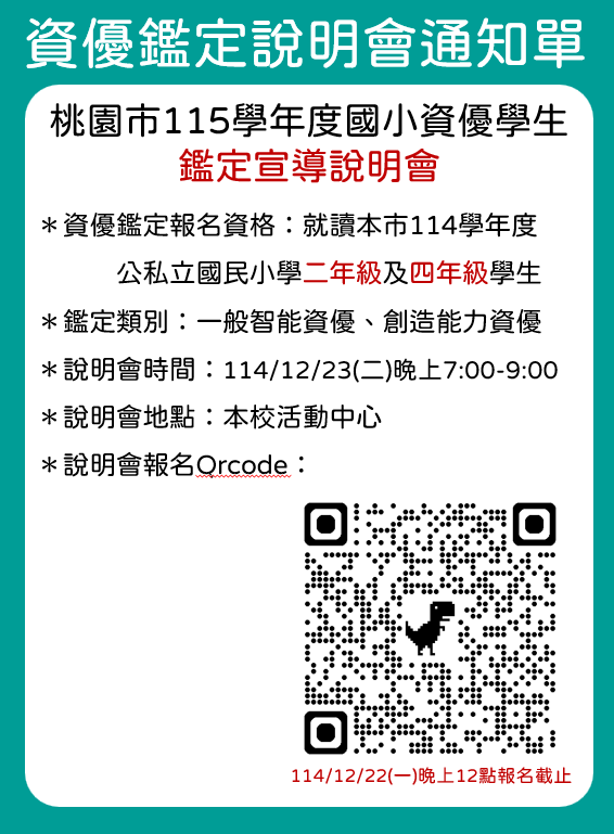 | 「115 學年度國民小學資賦優異學生鑑定家長說明會」一案,詳如說明,請各校所屬二升三及四升五年級學生和家長踴躍報名參加。 |